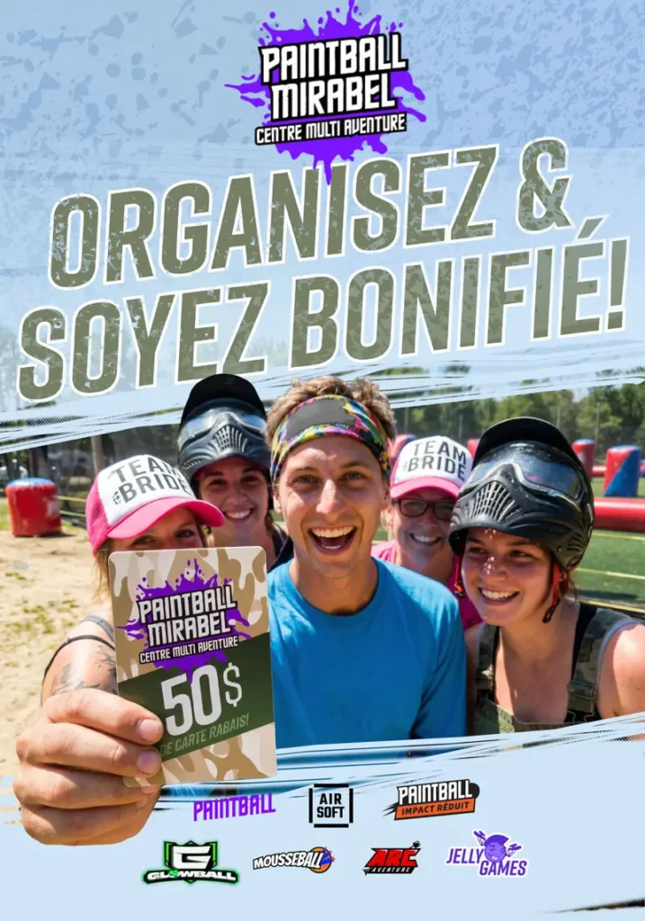 Vous êtes déjà passé jouer à l’une de nos activités offertes ? C’est pourquoi, en tant que clients fidèles chez nous, nous vous offrons d’organiser votre groupe de 10 joueurs et plus pour l’une de nos activités et obtenez 50$ en carte rabais applicable sur nos produits ou services offerts chez Paintball Mirabel.